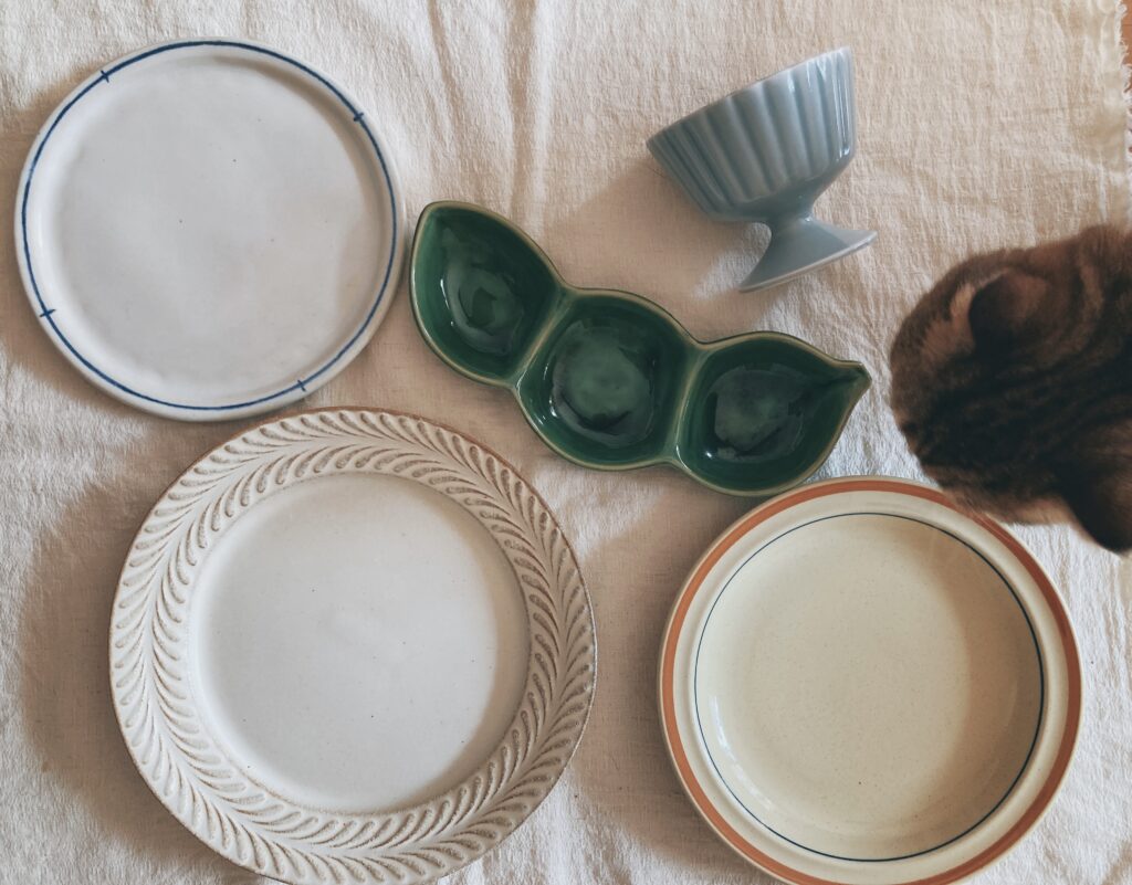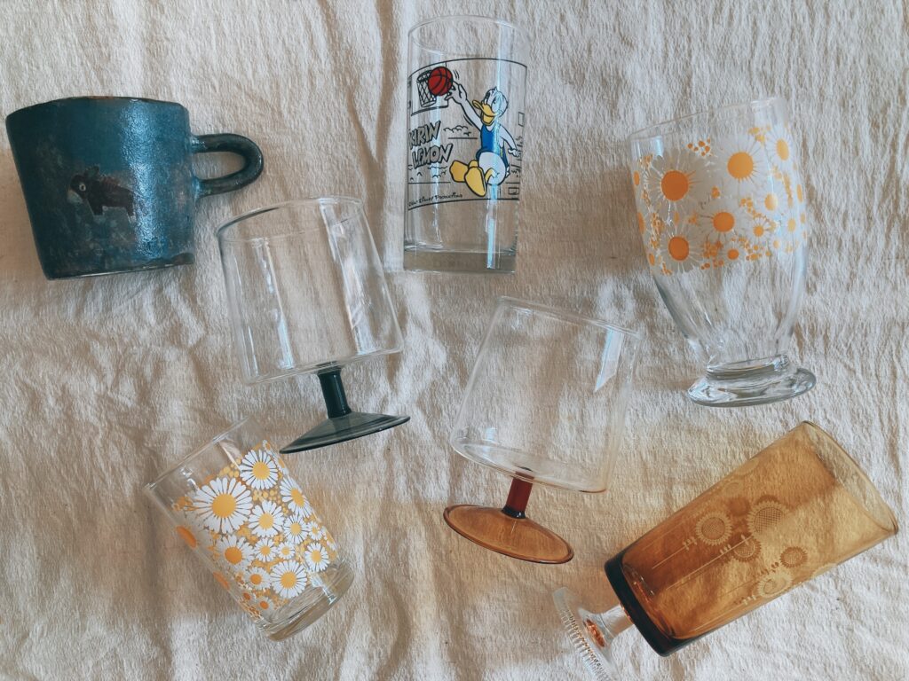 手作りの食器もあれば、「北欧暮らしの道具店」で買ったグラス。アンティーク雑貨屋で200円で買ったコップもぜんぶ好き。